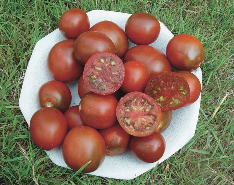 Fleischtomate mit runden, dunklen Früchten, 80 bis 150 g. Mittelfrüh reifend. Guter mild-süßer Geschmack, sehr gut zum So-Essen.