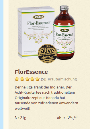 Alternative Schreibweisen: Essiac, Floressence, Flor Essenz, Floressenz, Floreszenz, flor-essence.