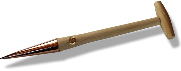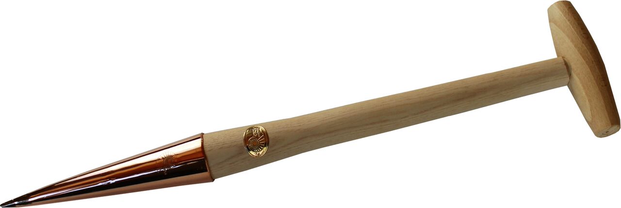 Reines Kupfer, die Spitze ist verschlossen mit einem Silber-Kupferlot, gedrechselter Eschenholzgriff.