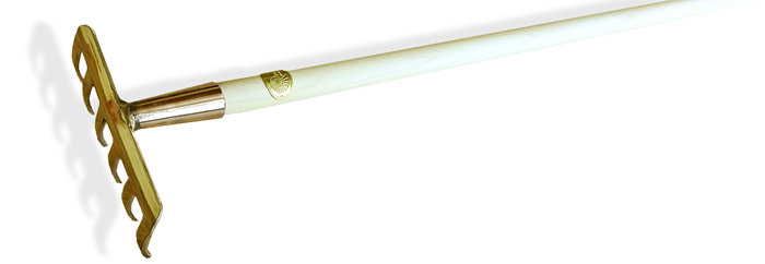 Praktisch für feines Rechen unter Dornenbüschen, zum Anebnen kleiner Flächen zwischen den Kulturpflanzen. Massive Kupferlegierung, Stiel aus unbehandelten Lindenholz.