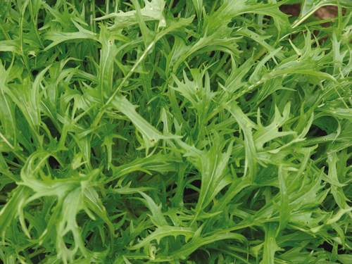 Mizuna bedeutet saftiges Gemüse und schmeckt nicht senfartig scharf, sondern mild. Dieser schnell und problemlos wachsende, sehr wüchsige Typ stammt aus China und wird in Japan angebaut. Er hat fein geschlitzte Blätter von roter oder grüner Farbe, die lange zart bleiben. Aussaat am bestem in Juni, aber auch zu anderen Terminen. Die Blätter werden so geschnitten, dass das Herz und einige Zentimeter Blatt stehen bleiben. Dann sind mehrere Ernten möglich. Erste Ernte schon nach 4 bis 6 Wochen. Noch schöner sind Einzelpflanzen, die komplett geerntet werden. Sie sehen aus wie Frisee-Endivien und vertragen etwas Frost. Sehr feines Gemüse