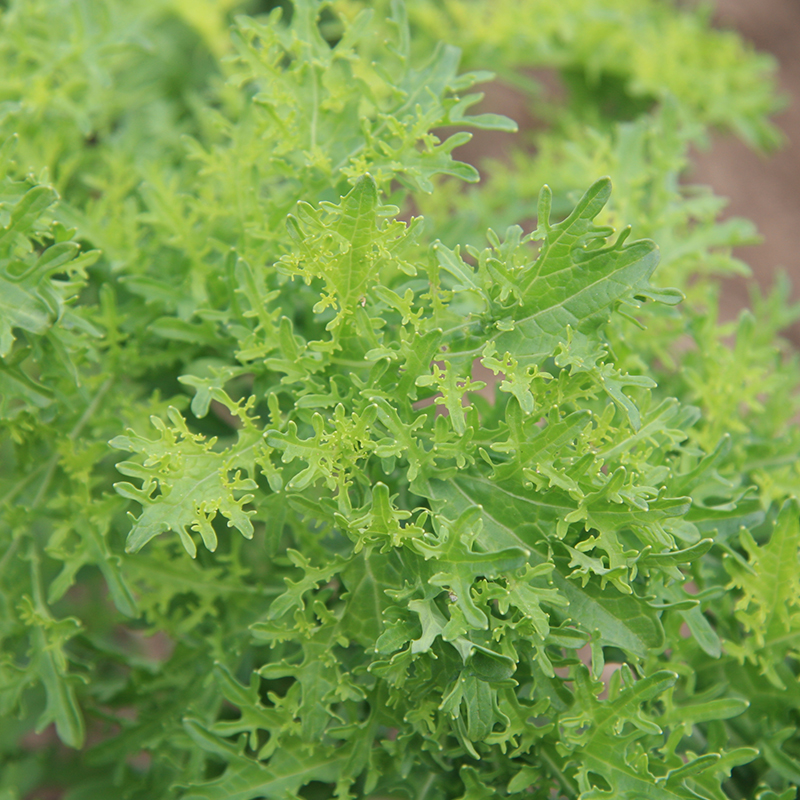 Senfkohl „Golden Frills“- Senfkohl mit fein gezähnten, hellgrünen Blättern, die einen pfeffrigen Geschmack haben. Verzehr im jungen wie im ausgewachsenen Stadium möglich.