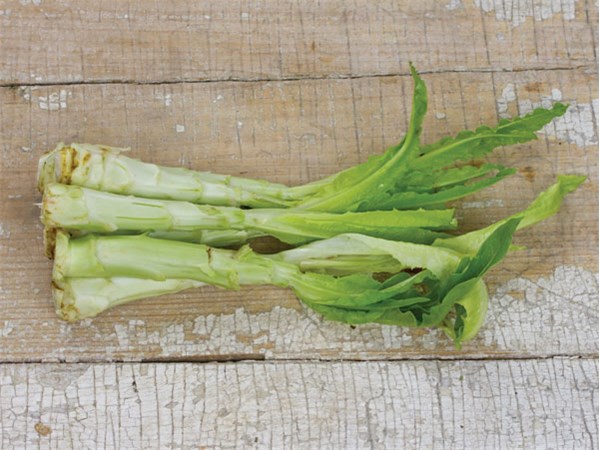 Vor 1885. Typ Römersalat. Sehr hohe, lockere Köpfe bis 40 cm. Lanzenförmige Blätter, purpurroter Saum. Rötliche. Strünke wie Spargel in Butter gedünstet. Sehr robust. Schnell schießend. kbA, Inhalt: 1 g