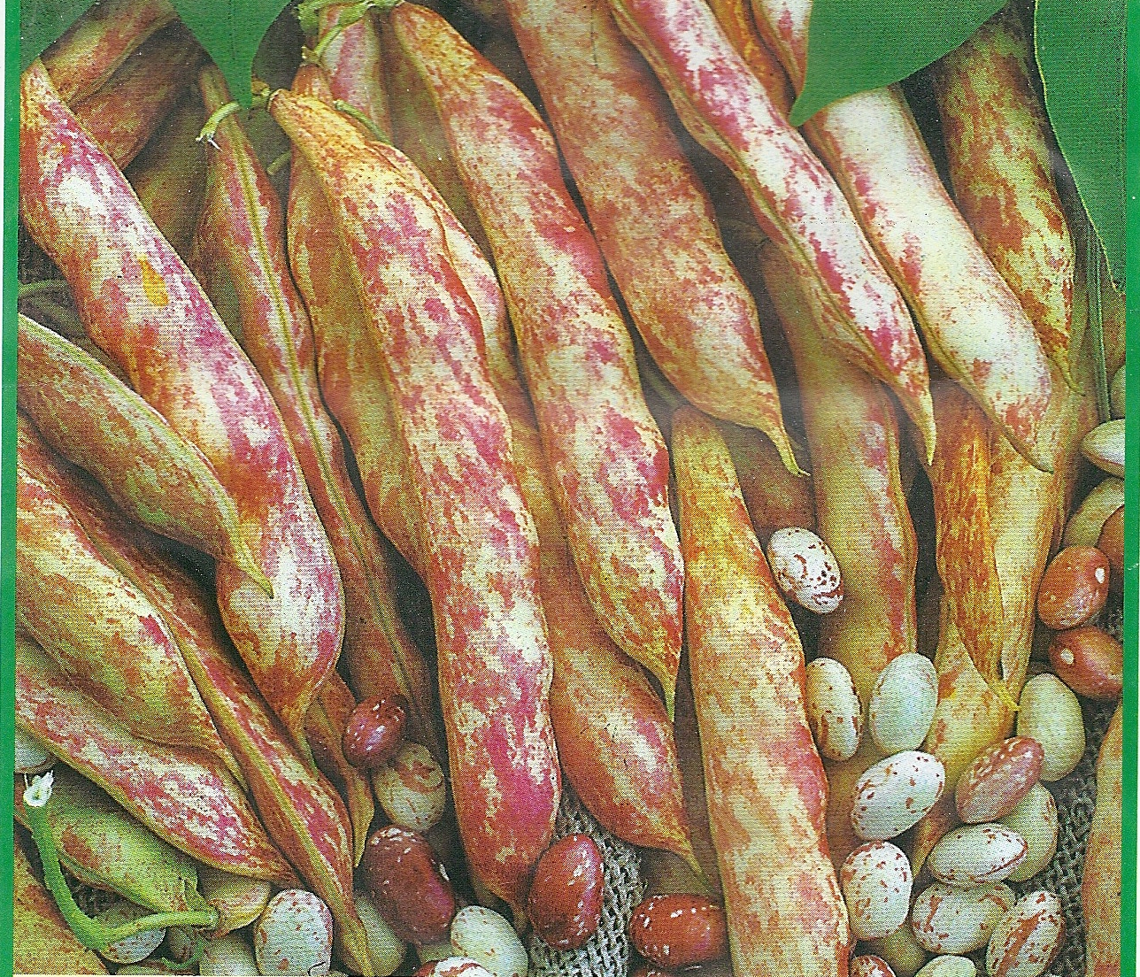 Borlottibohne Buschtyp. Rotgestreifte Hülsen. 13 cm lang, Korn hellgrün-rot gestreift.