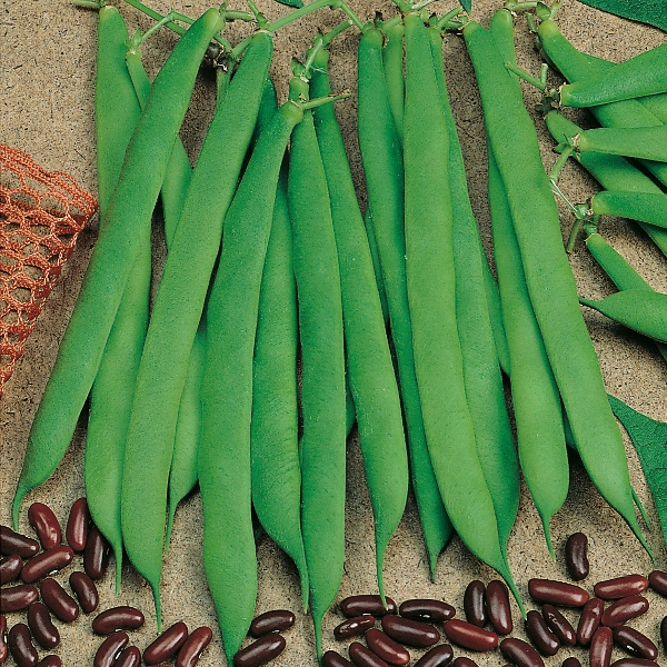Indianerbohne. Sehr verlässliche Sorte. Massenertrag. Hellgrüne, flache Hülsen, auch als Brechbohne verwendbar. Rote Körner. Körnerbohne.