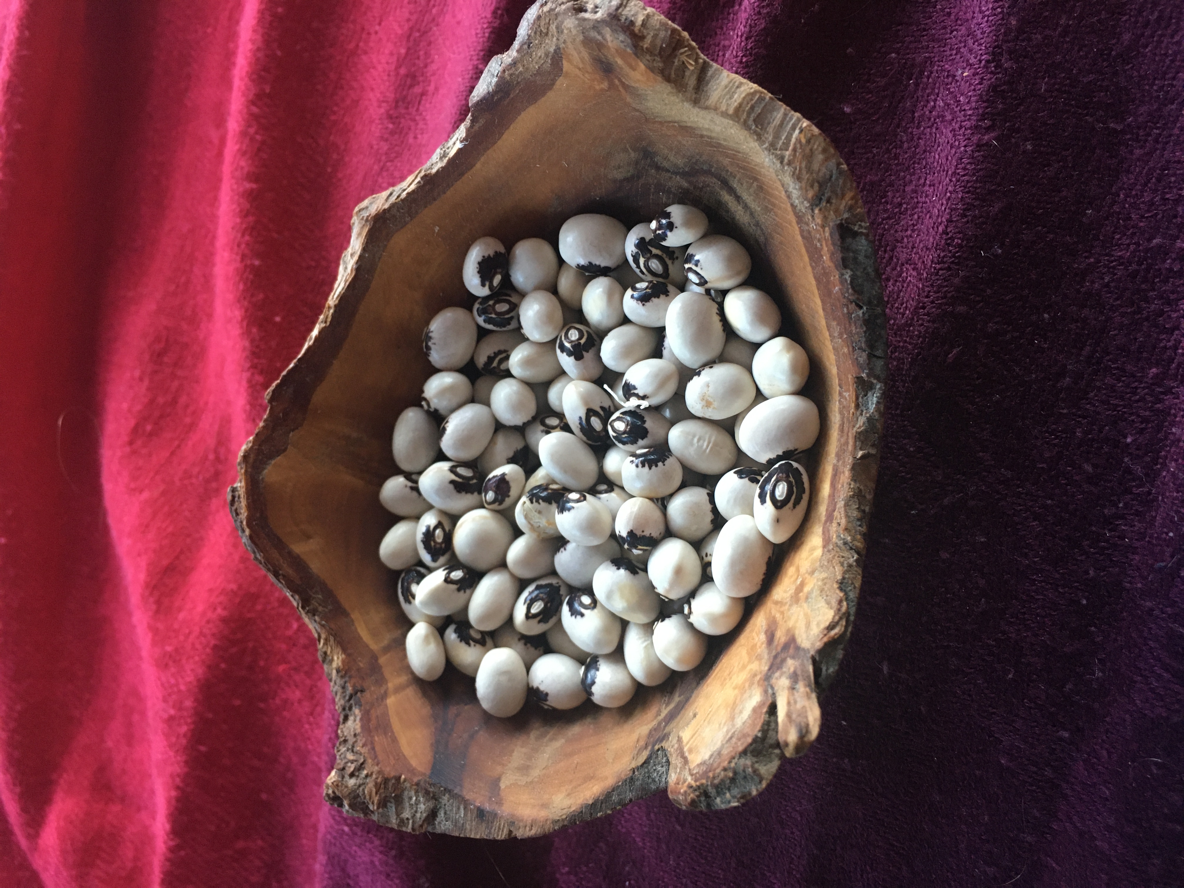 'Monstranzbohne' – Körnerbohne, Deko-Bohne Eine nahezu rundsamige (11 x 9 mm), weiße Bohne mit einer weinroten Zeichnung (Monstranz) um den Nabel. Die Zeichnung könnte man auch als einen fliegenden Engel deuten, daher heißt diese Sorte auch „Engelbohne“. Die schönen Samen werden in einigen Regionen als Perlen für Rosenkränze verwendet. Eine Bohne mit hochdekorativem Korn um die sich viele Legenden ranken. Die gängigste besagt, dass ein Pfarrer eine Monstranz vor Kriegsplünderern vergraben und die Stelle mit einigen Bohnen markiert hat. Die Bohnen liefen auf und brachten dann runde Samen, die am Nabel ein Muster gleich einer Monstranz trugen. Diverse Herkünfte, daher variieren Zeichnung und Körnerform leicht. Wir vermehren nur die rundesten und größten Samen mit deutlich erkennbarer Zeichnung. Rarität. Die Körner reifen relativ spät, daher ist eine Vorkultur in Töpfen von Vorteil. Inhalt: 12 Korn