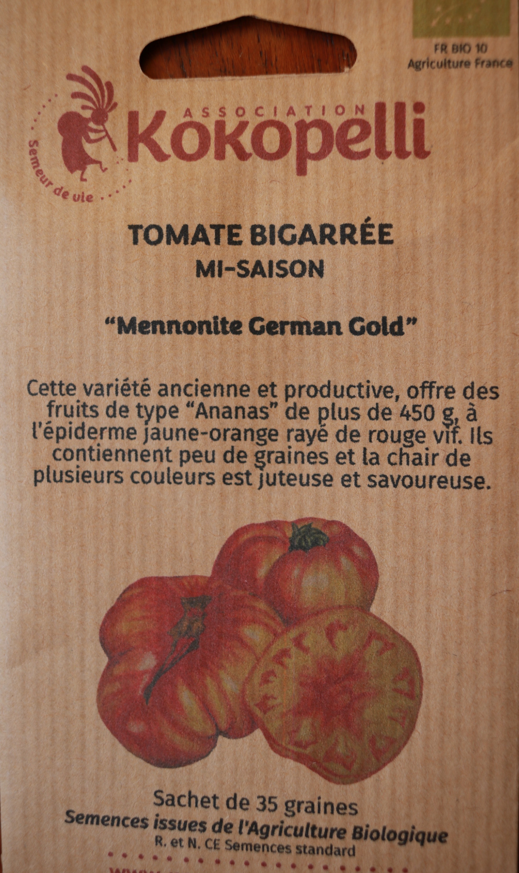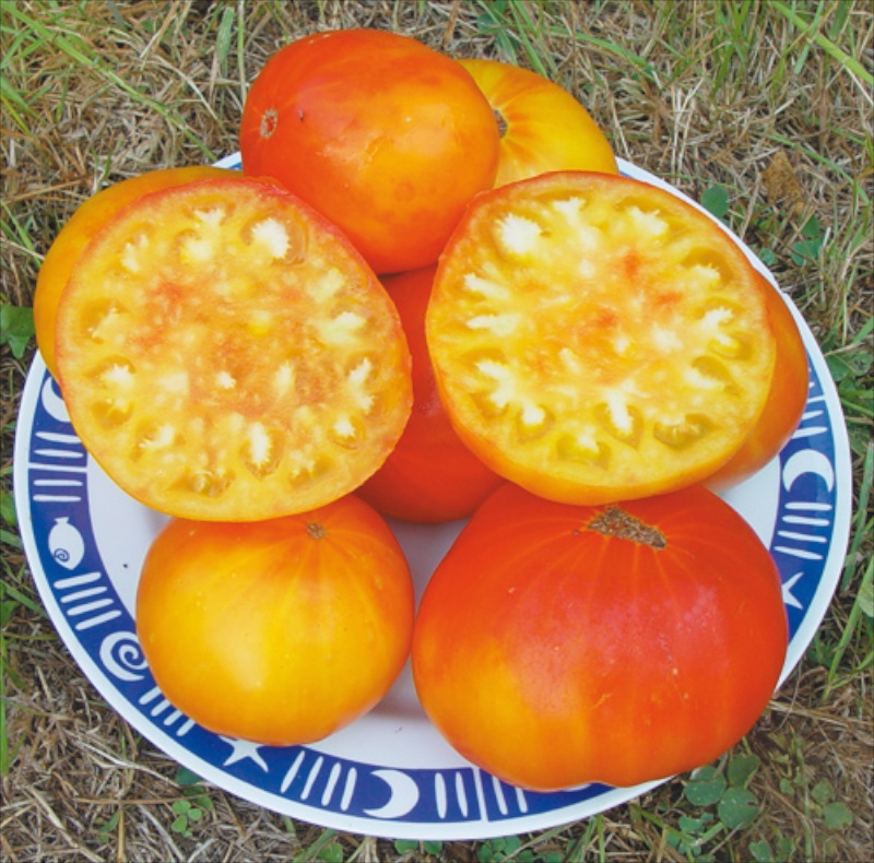 Eine bunte Fleischtomate, Typ Ananastomate, die wohl im 19. Jahrhundert mit den Mennoniten in die USA auswanderte und dort Sortenrein erhalten blieb. Früchte bis 500 Gramm. Eine niedrige Stabtomate. Inhalt 35 Korn kbA von Kokopelli.