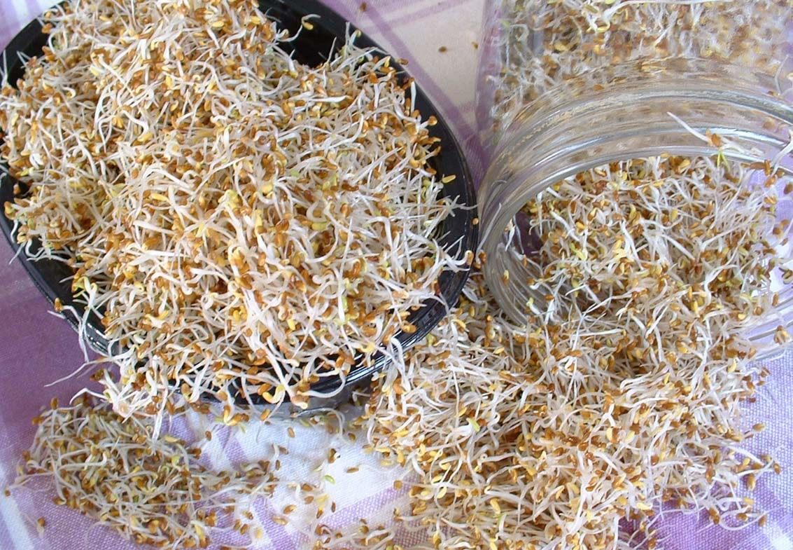Luzerne(Alfalfa) hat einen hohen Vitamin-C-Gehalt und findet in der Küche in Form von Keimsprossen erwendung. Aussaat: innen ganzjährig