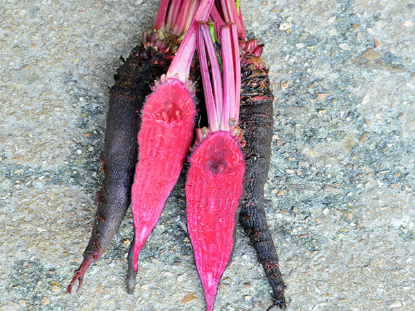 Eine der ältesten bekannten Sorten. Die längliche, dunkelrote bis ins Schwarze gehende Rübe wächst unter der Erde. Späte Sorte für die Ernte im Herbst.