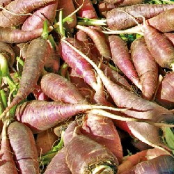 Lagerkarotte, langsames Wachstum. Außen purpurrot, innen weiß. Sehr dekorative Sorte.