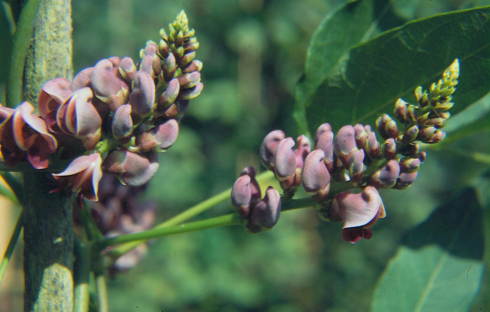 Apios (Erdbirne, Zimtwein) ist ein kletternder, winterharter Schmetterlingsblütler mit