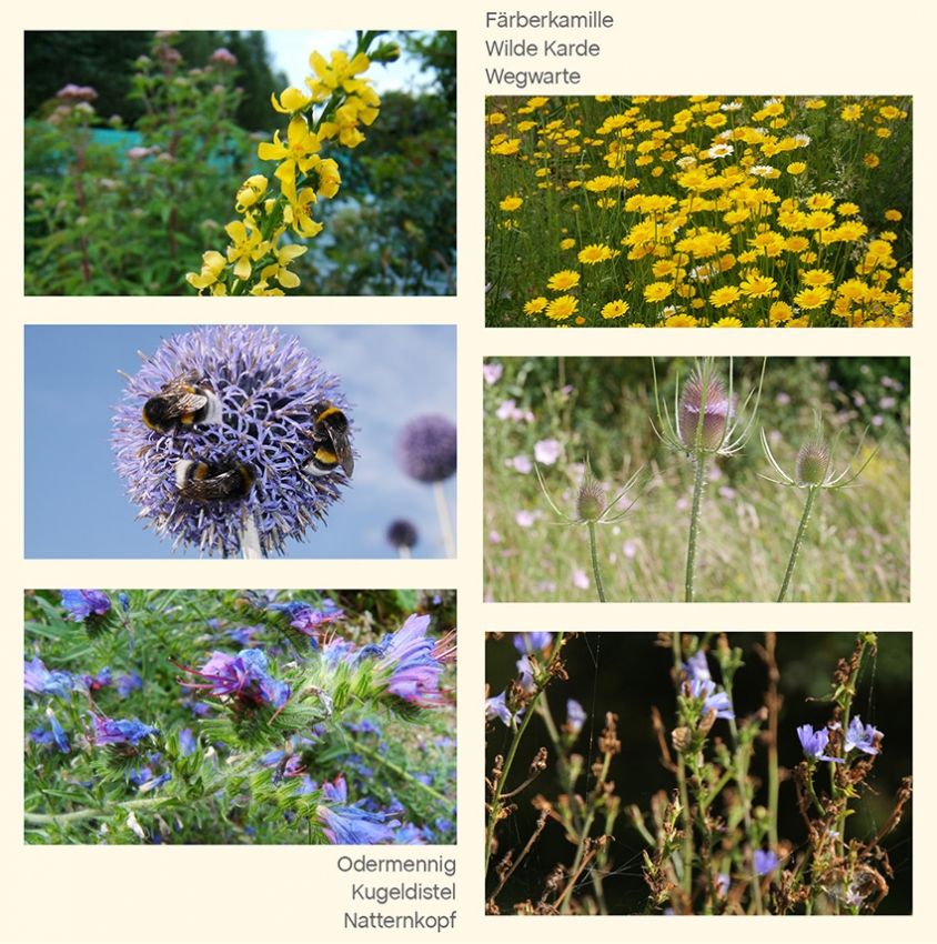 Arten: Odermennig, Ochsenzunge, Färberkamille, Wiesenflockenblume, Skabiosenflockenblume, Wegwarte, Wollköpfige Distel,