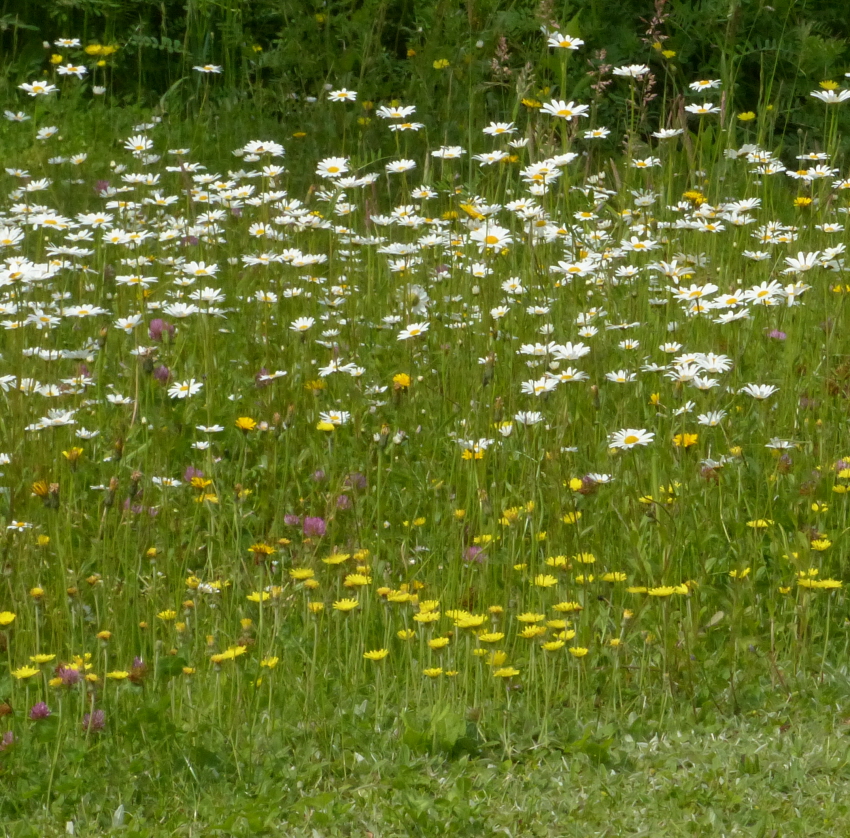 Arten: Schafgarbe, Kriechender Günsel, Gänseblümchen, Wiesenschaumkraut, Wiesenflockeblume, Echtes Labkraut,