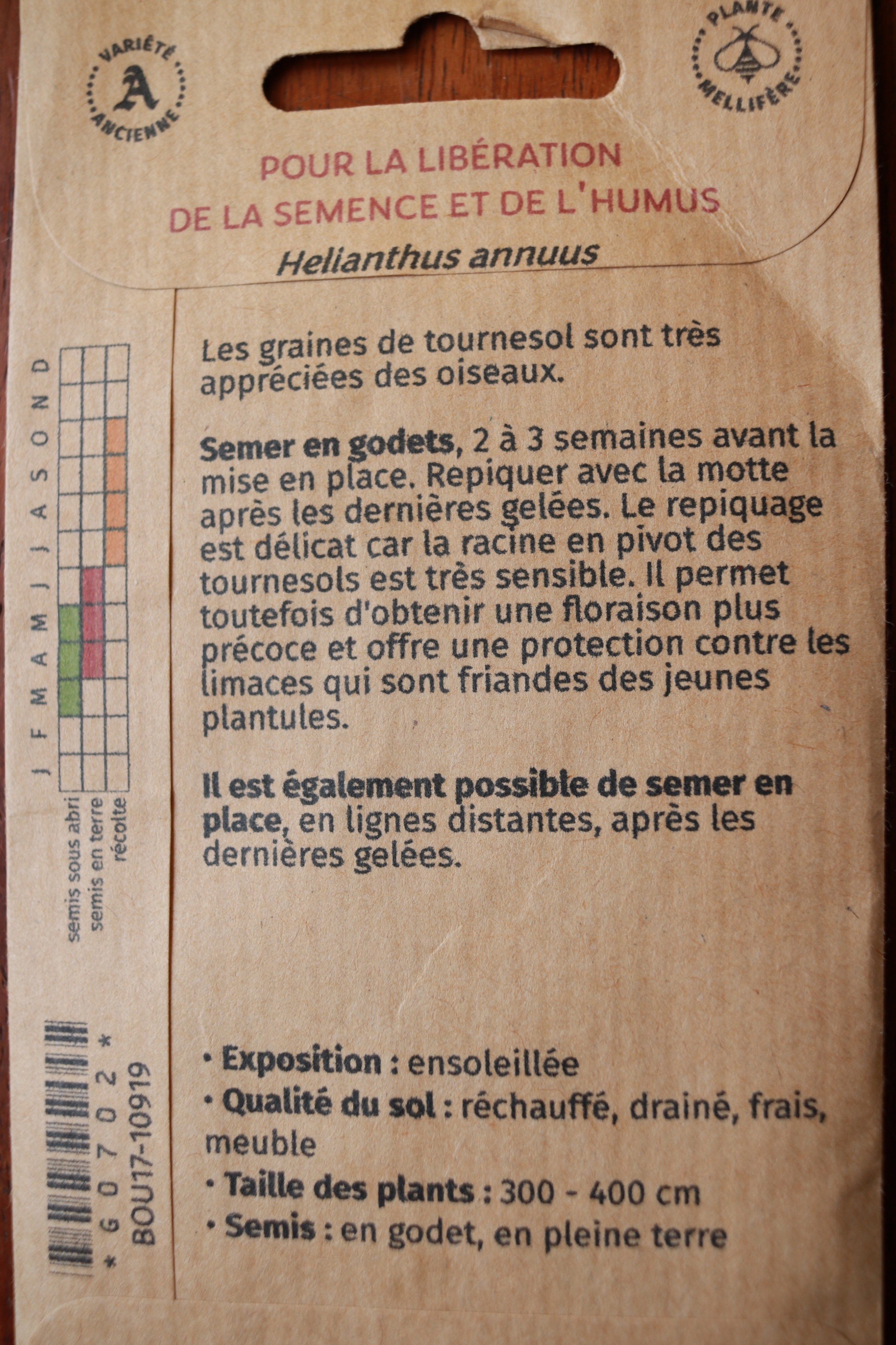 Eine uralte Sorte die 3,5 bis 4 m hoch wird, mit einem dicken, aufrechten Stiel mit einer einer gelben Blüte von 15 bis 25 cm Durchmesser und einer Fülle schwarzer Samen.